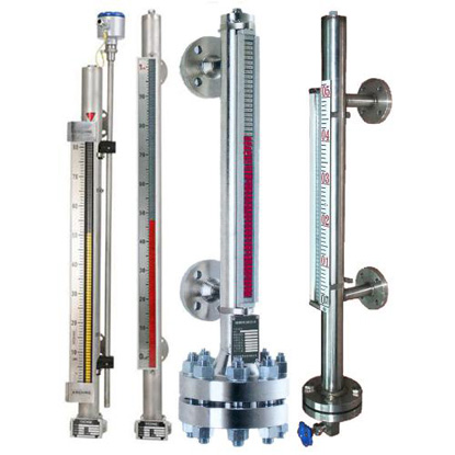 该类型的仪表都有一个容纳浮球的腔体(称为主体管或外壳),它通过法兰或其他接口与容器组成一个连通器;这样它腔体内的液面与容器内的液面是相同高度的,所以腔体内的浮球会随着容器内液面的升降而升降;这时候我们并不能看到液位,所以我们在腔体的外面装了一个翻柱显示器,因为我们在制造浮球时在浮球沉入液体与浮出部分的交界处安装了磁钢,它与浮球随液面升降时,它的磁性透过外壳传递给翻柱显示器,推动磁翻柱翻转180°;由于磁翻柱是有红、白两个半圆柱合成的圆柱体,所以翻转180°后朝向翻柱显示器外的会改变颜色(液面以下红色、以上白色),两色交界处即是液面的高度。